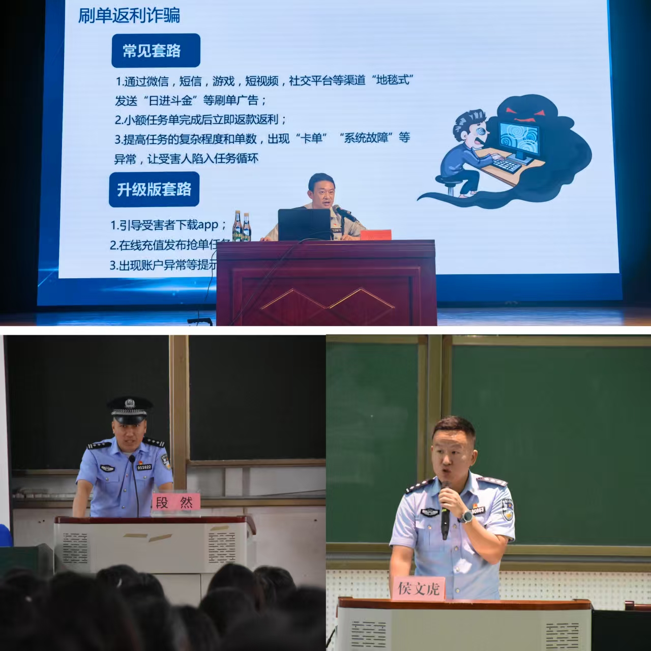 30日—31日,经开分局副局长曾亚、监督执法大队教导员闫文赋、昌宏路派出所所长齐植、民警戴岍岭等15名公安民警分别深入农生学院、旅游学院等各二级学院开展“开学安全第一课”专题讲座。授课民警结合高校近期典型案例,系统介绍电信诈骗、网络安全、校园周边治安等风险点,讲解诈骗话术识别技巧。