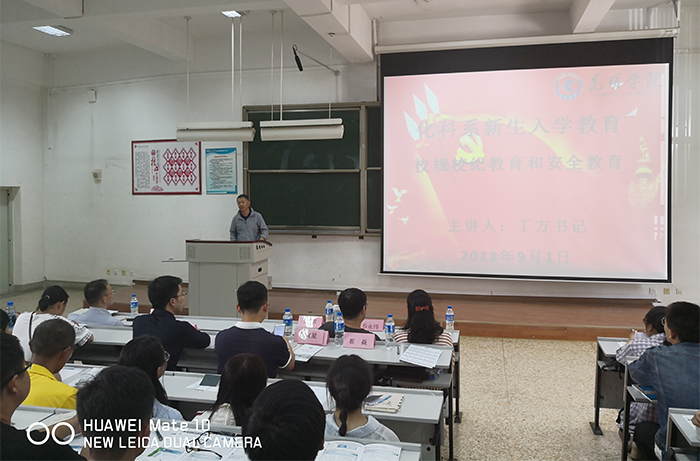 王宝玲主任做第一专题的入学教育。王主任给同学们详细介绍了学校的总体情况和化科系的专业设置、师资队伍、学生情况、科研和就业等方面内容,同时表达了对18级化科系新生的欢迎、期许与祝愿。