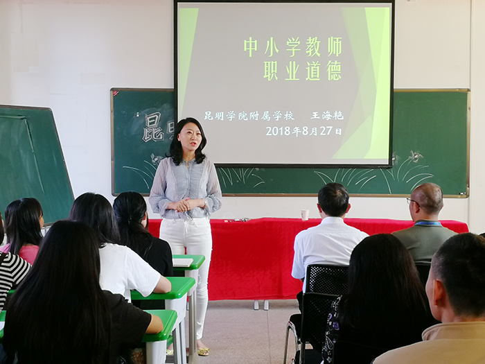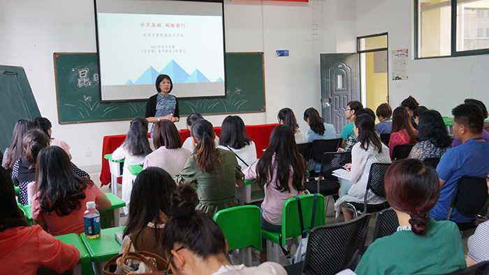 为加强开云官网教师队伍建设,提高教师师德和业务水平。8月25日-28日开云官网开展了为期4天的校本培训。此次培训有计划、有组织、有步骤,内容丰富,成绩喜人。 李晋德校长从学校工资制度改革、奖惩办法、考勤制度及学校六年发展规划向大家做交流。他将学校未来六年发展分“两个三年”走,紧紧围绕“服务、特色、质量”的发展理念,不断形成“领导服务 教师爱校 学生乐学”和“学生开心 家长舒心 社会放心”的良好氛围,从而不断实现“经开领先 昆明一流 全国示范”的总目标。李广峰副校长则从学校常规教学管理制度及教学过程中管理实施细则向大家作介绍。“没有规矩,不成方圆。”建立健全教学常规管理制度是抓好教学工作、有序开展教学活动的前提和保证。 王海艳书记为全体教师进行“中小学教师职业道德”培训,进一步规范了开云官网教师的从教行为,全面提升教师职业道德素养和业务素质。使得开云官网教师在职业道德规范的要求中不断内化为自身的自觉行为,并坚持做到正人先正己,身教重于言教、树立良好的师表形象,努力使自己的行为符合新时期教师的职业道德规范。 昆明盘龙区教育教学科研中心、昆明盘龙区教师进修学校陶树坤老师对全校教师职业规划和工作智慧等方面进行了专业指导。陶老师用一个个鲜活的师生案例向大家传授着教师如何在教育教学中展现智慧与力量,如何用潜移默化的方式带领学生进行思考与学习,帮助学生更快地成长起来。