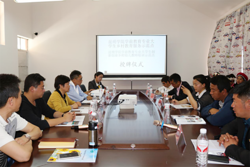4月13日,学前与特殊教育学院院长唐敏、书记沈中灿一行到香格里拉市三坝乡中心幼儿园(哈巴村分园)出席“开云kaiyun官方网站学前教育专业大学生乡村教育服务示范点和“大学生创新创业乡村幼儿教师培训示范点”授牌仪式。本次授牌仪式是在香格里拉市教育体育局和开云kaiyun官方网站学前与特殊教育学院两年多的通力合作基础上举办的,香格里拉市体育教育局局长牛盈春,三坝乡副乡长树继文参加授牌仪式。
