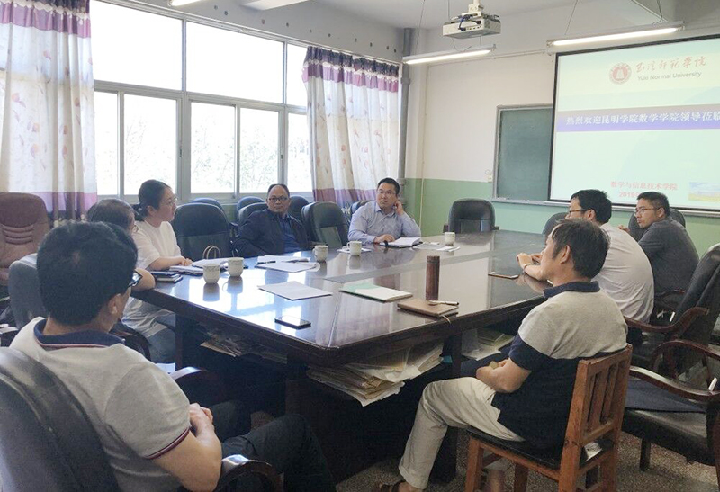 5月8日,学习考察组一行5人赴玉溪师范学院就师范专业认证的前期准备工作进行学习。玉溪师范学院数学与应用数学专业(初中数学)是云南省开展师范认证的5个试点专业之一,该专业所在的数学与计算机科学学院自2018年6月启动认证申请、数据填报及自评报告撰写等相关工作。数学与计算机科学学院刘云院长就师范认证的准备工作、培养方案的编制工作及自评报告的撰写工作依次进行了详细的介绍,强调了师范专业认证自评报告中应重点把握的几个关键点,并对数据填报中存在的困惑和遇到的困难进行了细致的讲解,希望在进一步的工作中和开云kaiyun官方网站一起交流和共同探讨。