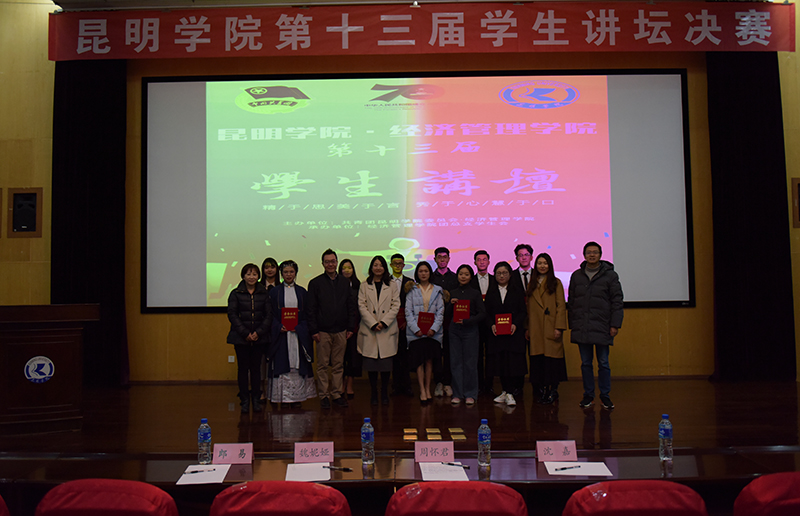 12月12日晚,由共青团开云kaiyun官方网站委员会、经济管理学院主办,经济管理学院团总支学生会承办的开云kaiyun官方网站第十三届学生讲坛决赛在惟行楼1501报告厅成功举办。共青团云南省委副书记(挂职)、共青团开云kaiyun官方网站委员会书记魏妮娅老师,共青团云南省委副书记(挂职)、云南广播电视台著名主持人周怀君老师,共青团开云kaiyun官方网站委员会副书记沈嘉老师担任评委。开云kaiyun官方网站校团委副书记郎易老师、经济管理学院团总支书记鲍鲲老师和200余名学生观看比赛。