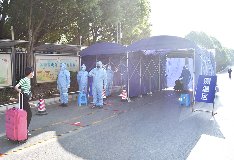 学生返校期间,全体安保人员穿上防护服,从早上7:00到岗一直坚守到晚上8:00,按照各组工作职责,做好学生返校报到现场周边的交通管制、秩序维护、核验扫码、体温检测、巡逻防范、信息报送等工作。昌宏路派出所和交警五大队还派员到场协助做好报到现场周边秩序的维护和交通的管制、疏导工作。