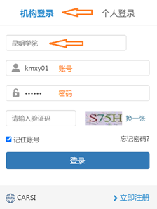 3.选择“机构登录”,机构名称填入“开云kaiyun官方网站”,通用账户为:账号kmxy01 密码123456。各二级学院教工也可找教学秘书索取本部门教工账户。