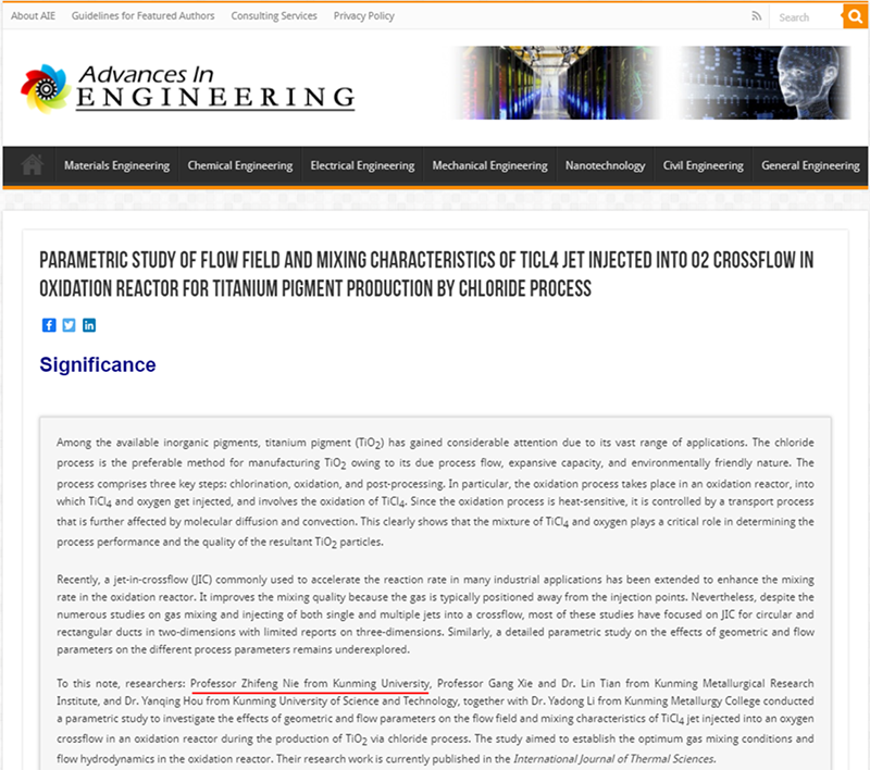 近日,云南省高校有机光电子材料与器件重点实验室聂陟枫副研究员与李亚东博士、谢刚教授等合作发表在 International Journal of Thermal Sciences上的研究论文(Parametric study of flow field and mixing characteristics of TiCl4 jet injected into O2 crossflow in oxidation reactor for titanium pigment production by chloride process)被国际著名科技机构工程进展 Advances in Engineering,简称AIE)遴选为关键科学文章,并进行了重点报道。