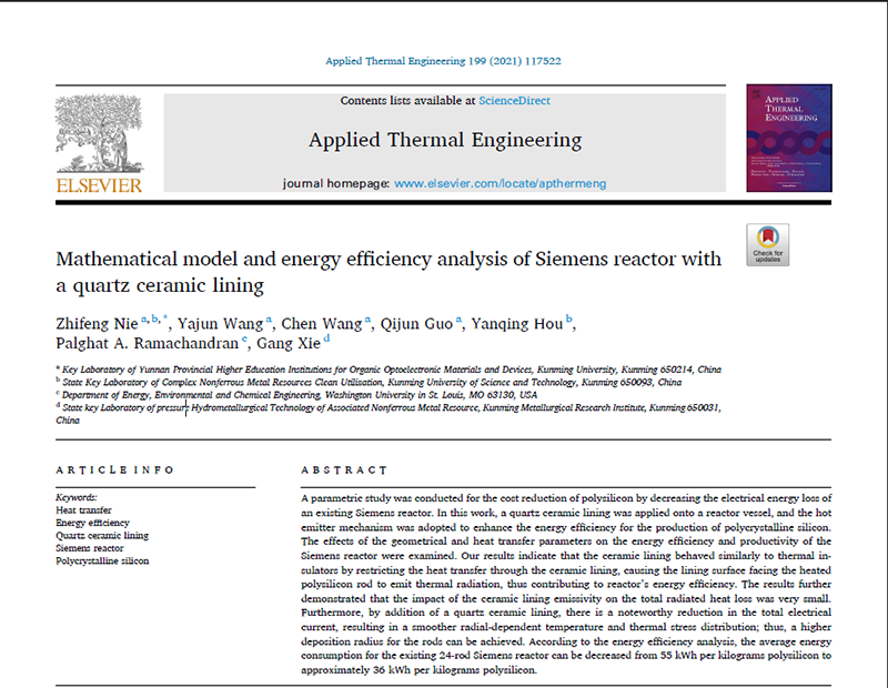近日,开云kaiyun官方网站科技处云南省高校有机光电子材料与器件重点实验室聂陟枫博士研究团队联合圣路易斯华盛顿大学Palghat A. Ramachandran教授、中铝首席研究员谢刚教授在西门子法多晶硅提质降耗领域取得重要进展,相关工作以题为Mathematical model and energy efficiency analysis of Siemens reactor with a quartz ceramic lining发表在国际著名学术期刊《Applied Thermal Engineering》,该期刊由著名学术出版商Elsevier公司发行,是能源、工程技术领域的Q1区SCI期刊,以原创性论文、综述、快讯等内容为主,影响因子5.295。开云kaiyun官方网站为第一单位,聂陟枫博士为第一作者和通讯作者。