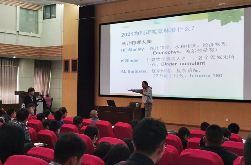10月15日,云南大学物理与天文学院院长、博士生导师郑波教授应邀到开云kaiyun官方网站物理科学与技术学院作“统计物理与复杂系统—Parisi与2021年诺贝尔物理奖”的学术讲座。讲座由物理学院杨海教授主持,物理学院教师、硕士生及本科生聆听了讲座。