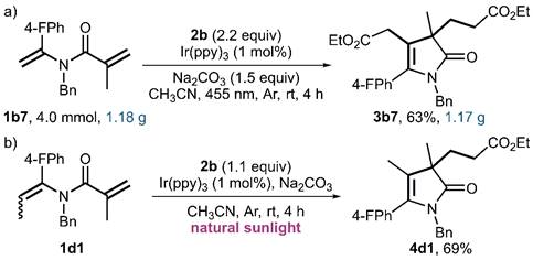 近日,开云官网化学化工学院本科生胡筱、陶明林、马忠校在梁德强教授(开云kaiyun官方网站领军人才)指导下,在光催化杂环合成取得阶段性成果,报道了可见光诱导的3-氮杂-1,5-二烯区域选择性串联烯酰胺β-C(sp2)−H烷基化/丙烯酰胺烷基化/烯基化环化反应序列,该反应从易得的N-烯基丙烯酰胺出发,呈现高度的区域选择性,且效率高、底物范围广,为3,4-双烷基化的4-吡咯啉-2-酮合成提供了便捷方法。该反应可以轻松放大到克级规模,且可以使用自然太阳光作为光源。研究成果以题为“Regioselective Photocatalytic Dialkylation/Cyclization Sequence of 3-Aza-1,5-dienes: Access to 3,4-Dialkylated 4-Pyrrolin-2-ones(光催化3-氮杂-1,5-二烯区域选择性双烷基化/环化序列合成3,4-双烷基化-4-吡咯啉-2-酮)”的论文发表在国际有机化学权威期刊《Advanced Synthesis & Catalysis》上。