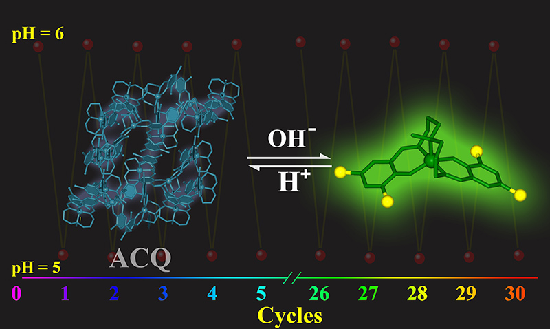 本文设计并合成了一种新的pH探针[Ni(3,5Cl-saldmpn)]3,光学特性研究表明该探针具有优异的信噪比,对比同系物其荧光强度呈指数增长,并且随着pH从5.1增加到6.0时有可见的颜色变化。此外,该探针具有突出的稳定性和可逆性,在30个循环后信号强度保持在初始信号强度的90%以上。为了更好地了解所报道探针的特殊荧光行为,该工作进一步结合结构分析和理论计算探讨了特殊超分子聚集体引起卤原子猝灭效应的可能机制。