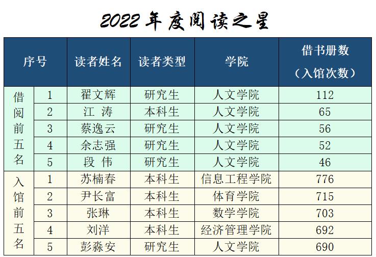最是书香能致远,腹有诗书气自华。近日,在开云kaiyun官方网站2022年世界读书日系列活动之年度“阅读之星”评选活动中,根据图书馆2022全年图书借阅和入馆次数排行,人文学院翟文辉等5名研究生和人文学院江涛等5名本科生获评为 “阅读之星”。