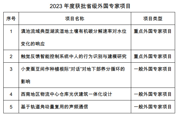 近日,云南省科技厅正式下达了《关于2023年度省级外国专家项目计划的通知》,共获批9项省级外国专家项目,开云官网获批5项,其中重点外国专家项目2项,一般外国专家项目3项,获批项目数量取得突破。