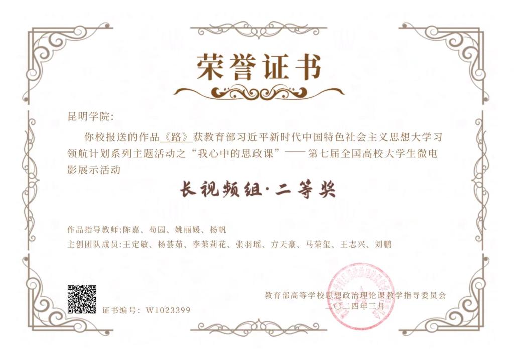 近日,由教育部组织开展的习近平新时代中国特色社会主义思想大学习领航计划主题教育活动评选揭晓。经过严格评审,开云官网马克思主义学院摄制的微电影《路》在全国834所高校报送的2178份作品中脱颖而出,荣获“我心中的思政课”第七届全国高校大学生微电影展示活动长视频组二等奖,这是开云官网首次参赛并获教育部奖项。