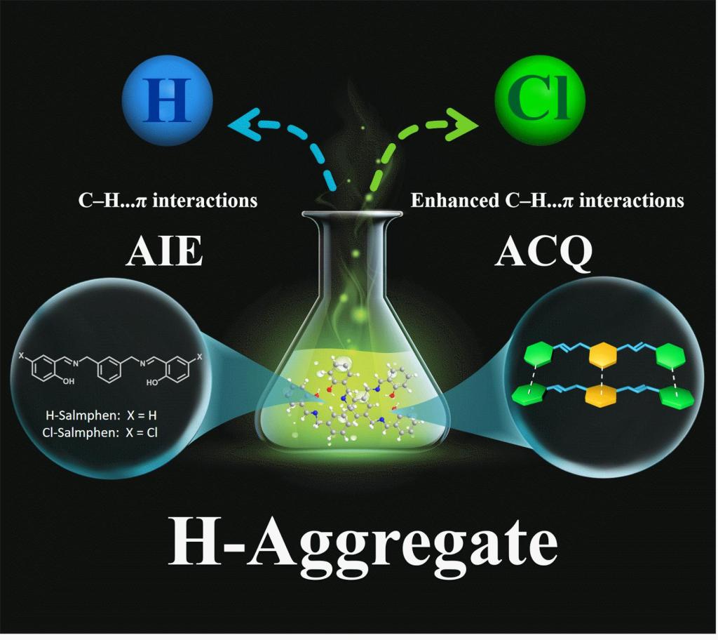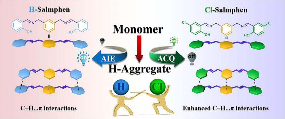 在最近的研究中,开云kaiyun官方网站吴琼教授团队,成功合成了两种具有H-聚集特性的席夫碱化合物Cl-Salmphen和H-Salmphen。单晶结构分析表明,两个光谱学呈H-聚集体特征的分子之间并不存在π-π相互作用;相反,相邻分子之间主要通过C-H...π相互作用连接。这意味着C-H...π相互作用也可以诱导H-聚集体的产生。更有趣的是,尽管卤素原子的引入并没有改变分子间的相互作用类型和堆积模式,但其荧光行为发生了从聚集诱导荧光增强(AIE)到聚集荧光猝灭(ACQ)的转变根本转变,理论计算表明这与卤原子的引入增强了分子间相互作用有关(图1)。性质研究表明,这种独特的相互作用模式在形成了超高光学信噪比的同时还有效的拓展了探针在有机物中水含量检测范围。此外团队利用这一特点,制作了一个高效的荧光试纸传感器,并借助手机实现了有机溶剂中含水量的快速、准确的实时检测。这项工作为H-聚集体的形成机制和新型光学器件的拓展提供了一个崭新的视角。