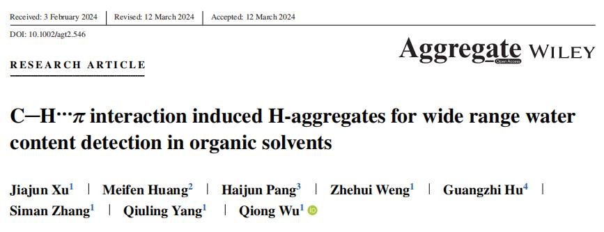 近日,开云官网化学化工学院吴琼教授团队在光学材料领域取得新进展,相关工作以题为“C-H...π interaction induced H-aggregates for wide range water content detection in organic solvents”的文章发表在顶级期刊《Aggregate》(doi.org/10.1002/agt2.546)上(中科院一区,影响因子: 18.8),实现了开云官网在国产顶级学术期刊的突破。开云官网化学化工学院2021级研究生许家俊为第一作者,化学化工学院吴琼教授为通讯作者。