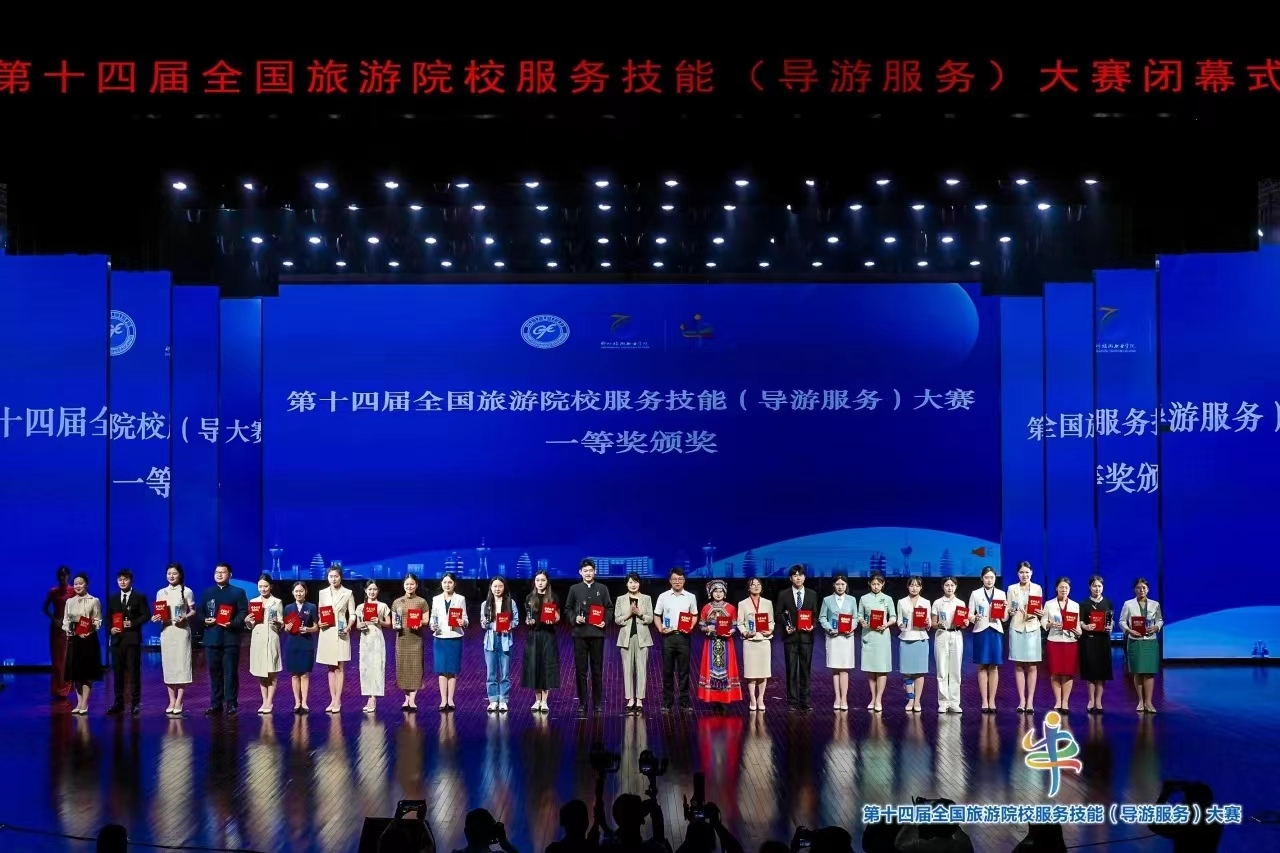 第十四届全国旅游院校服务技能(导游服务)大赛,由文化和旅游部市场管理司、中国旅游协会指导,中国旅游协会旅游教育分会主办,郑州旅游职业学院承办。5月23日至27日,来自全国30个省(自治区、直辖市)303所高等院校和中职学校的883名选手,齐聚郑州,共襄盛举。比赛设普通话导游服务和英语导游服务两个项目,每个项目,由理论考核、导游讲解、专题讲解、才艺展示四个部分组成,全面考查学生的综合能力。经过激烈角逐,旅游学院2023旅游管理专升本班学生朱一豪荣获中文组一等奖,并以优异表现位列中文组得分第十名;2023级酒店管理专升本班学生吴照文获得英语组一等奖,实现了旅游学院在英语组一等奖上零的突破;2023级旅游管理专升本班学生朱优、费凡分别荣获中文组和英文组二等奖。旅游学院以团体总分第十三名的成绩荣获团体奖,为旅游管理专业自参赛以来的最好成绩。