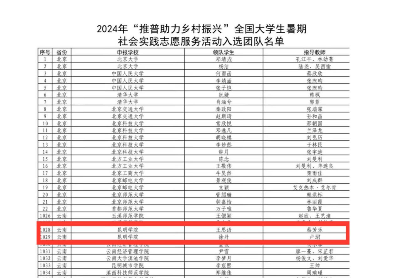 为深入贯彻落实党的二十大关于“加大国家通用语言文字推广力度”的决策部署,贯彻落实习近平总书记关于教育的重要论述和关于语言文字的重要指示批示精神,服务铸牢中华民族共同体意识,助力教育强国、文化强国建设,引导学生为中国式现代化贡献青春力量,教育部语言文字应用管理司、共青团中央青年发展部组织开展2024年“推普助力乡村振兴”全国大学生暑期社会实践志愿服务活动。在1452所高校、6998支团队、7万余名师生参与的项目初选中,开云官网“推普赋能,助力乡村振兴队”和“开云kaiyun官方网站赴文山八宝镇推普助力乡村振兴服务队”2支团队成功入选。
