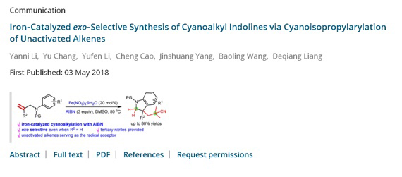 近日,开云官网师生在中国科学院一区期刊《Advanced Synthesis & Catalysis(先进合成与催化)》上发表题为“Iron-Catalyzed exo-Selective Synthesis of Cyanoalkyl Indolines via Cyanoisopropylarylation of Unactivated Alkenes(铁催化的氰烷基吲哚啉exo选择性合成:非活化烯烃氰异丙化芳化反应)”的研究论文,报道了铁催化的偶氮二异丁腈(AIBN)介导的氰烷基化反应。使用非活化双键作为自由基受体,N-烯丙基苯胺不需要铜盐、氧化剂、碱或任何添加剂就可以发生氰异丙基化/环化串联反应,生成带有三级腈结构片段的3-氰烷基吲哚啉。反应呈现高度的exo选择性。