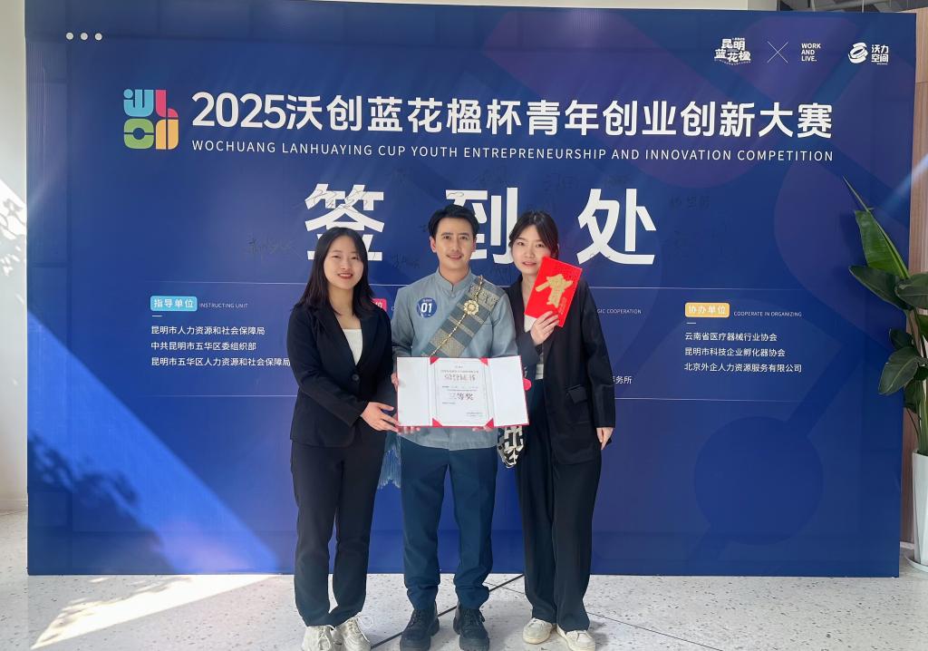 4月28日,在昆明市人力资源和社会保障局、中共昆明市五华区委组织部、昆明市五华区人力资源和社会保障局主办的2025“沃创蓝花楹杯”青年创业创新大赛(国际组)比赛中,国际学院与旅游学院联合组建的跨文化团队,凭借突出的创新能力与默契的团队协作,喜获三等奖。