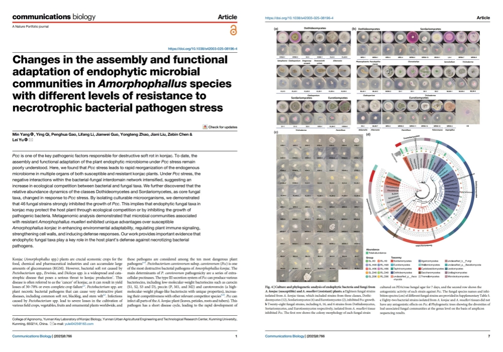 5月19日,云南省魔芋生物学重点实验室课题组在Nature旗下期刊Communications Biology (通讯生物学) (中科院一区Top期刊) 上发表最新科研成果 "Changes in the assembly and functional adaptation of endophytic microbial communities in Amorphophallus species with different levels of resistance to necrotrophic bacterial pathogen stress"。该研究发现寄主植物内生微生物组在抵御病害侵染过程中,内生真菌类群在寄主植物防御细菌性病原体中起着更为重要的关键作用,这一发现为进一步解析珠芽魔芋“珠芽金系列”品种的抗软腐病机制提供了理论基础,同时也为作物细菌性病害生防菌开发及魔芋软腐病害的有效防控提供了新思路。
