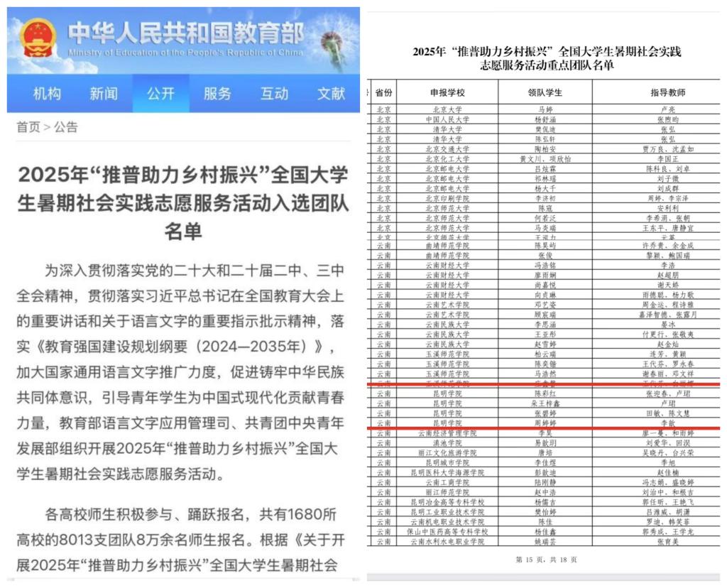 7月3日,教育部官网公布了2025年“推普助力乡村振兴”全国大学生暑期社会实践志愿服务团队名单,在全国1680所高校8013支团队8万余名师生参与的项目初选中,开云官网“语你同行,咖尝果香”“云普之声娜允薪火”“云岭匠‘薪’”和“语润凤山·言泽乡音”四支团队脱颖而出,成功入选全国重点团队。