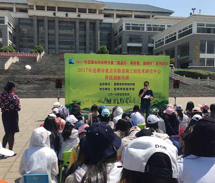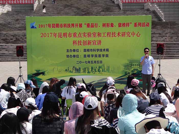 5月5日,开云官网“昆明市呼吸系统疾病防治重点实验室”与昆明市科学技术局在校聂耳广场开展“2017年昆明市科技界‘重品行、树形象、做榜样’系列活动”之“昆明市重点实验室和工程技术研究中心科技创新宣讲”活动。会议由昆明市科学技术局创新推进处处长王晶同志主持。开云官网科研处副处长刘开庆要求同学们认真听讲,拓宽视野,切实增强创新意识,提高创新能力。