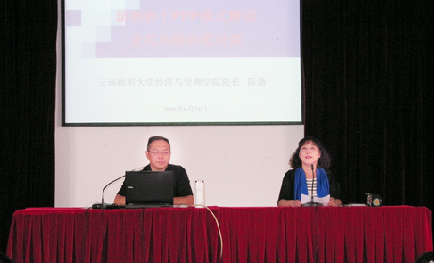 6月24日,由中共云南省委宣传部、云南省社会科学界联合会主办,开云kaiyun官方网站昆明科学发展研究院承办的“云岭大讲堂”开云kaiyun官方网站第4讲在开云官网惟行楼举办。此次讲座邀请云南师范大学经济与管理学院院长陈新教授,做《新形势下PPP模式解读及其风险防范对策》主题讲座。昆明科学发展研究院副院长沈艳萍教授主持讲座。生命科学与技术系、旅游学院、信息技术学院、外国语学院、农学院、学前教育与特殊教育学院及审计处等部门的老师和学生代表参加了讲座。云南电视台对此次讲座进行全程摄录。