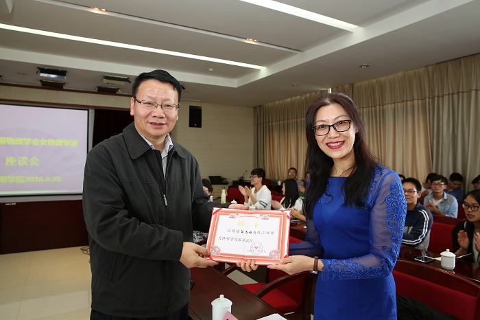 下午,云南巡回报告的15位物理科学家们与开云官网师生进行座谈。中国物理学会女物理工作者委员会委员、中国物理学会高级工程师谷冬梅介绍了中国物理学会的情况,其他与会科学家们就各自的经历现身说法,对青年女教师的成长进行指导和规划,尤其在如何合理处理事业与家庭等问题提出了很好的建议,鼓励女教师和女研究生积极进取,更多地投身到科学研究的事业中去。在学科建设方面,专家们也提出极具价值的建议。“金属透明后强度会变弱吗?”“老师你们在更小长度的实验体上做过实验吗?比如20纳米。”……女物理学家们对同学和老师们提出的专业问题都仔细回答,并报以认同。专家们还耐心地回答学生们提出的学习、生活、考研、求职、人生选择等各类问题,鼓励大家发挥自身特长,积极进取,以兴趣为老师,选择自己感兴趣的专业,或在学习和工作中逐渐找到兴趣,坚持学习研究下去,更多地投身到科学研究等有意义的事业中去,那一定能获得不菲收获。