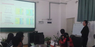 在报告中,武威博士提到有机薄膜的功能纳米结构和分子取向密切相关:例如电荷传输,光吸收和磁性。有机纳米材料结构的表征对了解其基本性质的和控制其生长质量是不可缺少的。武威博士简单描述了传统的表征手段,包括X射线衍射仪(XRD),近边X射线吸收精细结构(NEXAFS)等手段,并提到它们在某些晶型(例如在CuPc/C60混合的太阳能电池中)表征分析中的局限性,进而,提出了一种可以替代传统表征方式的方法——电子顺磁共振光谱(EPR)。EPR光谱的模拟是利用费米黄金规则以及根据不同分子取向做平均(包括分子平面垂直于或平行于衬底)来构建的。武威介绍了电子顺磁共振光谱(EPR)的应用优势、应用领域等内容,分析了如何利用电子顺磁共振(EPR)更有效地鉴别有机太阳能电池中的分子排列取向。同时,该方法也可以拓展到自旋发光二极管和自旋场效应晶体管等领域的研究中,为今后研究分子排列提供了一种可靠的分析方式。报告结束后,武威同开云官网师生进行了热烈的讨论,耐心解答大家的提问,并针对学校学科团队在科研过程中所碰到的问题,进行了充分的讨论。