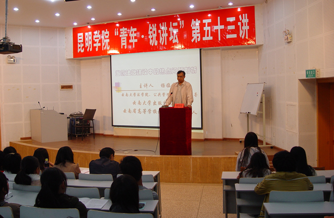 11月22日晚,由校团委主办的“青年•锐讲坛”第五十三讲——“中国法制建设中的热点问题剖析”在青年中心学生报告厅成功举办。本场讲座邀请到云南大学出版社总编辑、云南大学公共管理学院博士生导师、云南大学法学院硕士生导师杨临宏担任主讲人。