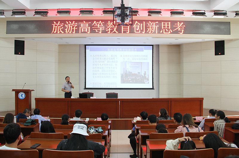 6月5日,四川旅游学院原党委书记黄维兵教授应邀到校作题为“旅游高等教育创新思考”的学术讲座。校长黎素梅和旅游学院师生一同聆听讲座。副校长王凡主持讲座。